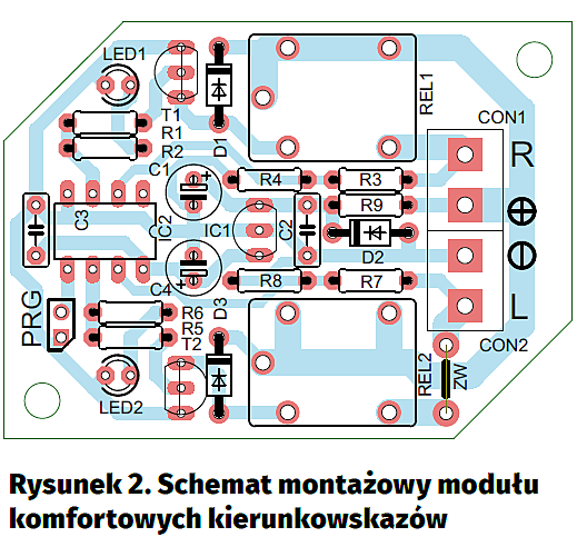 Moduł wymaga jedynie doprowadzenia zasilania oraz obwodu lewego i prawego kierunkowskazu, dzięki czemu dołączenie do instalacji auta jest stosunkowo łatwe. Sygnały złączy CON1 i CON2 są opisane na płytce. Zasilanie modułu należy doprowadzić z dowolnego obwodu, w którym napięcie występuje po przekręceniu kluczyka w stacyjce. Zapewne obwód będzie zabezpieczony bezpiecznikiem, więc może zajść konieczność wymiany bezpiecznika na taki z większym prądem znamionowym, ponieważ zasilanie świateł kierunkowskazów, w trakcie pracy modułu, będzie pobierane z tego obwodu. Podłączenie do kierunkowskazów można łatwo zrealizować np. przy złączach reflektorów (nawet tylnych). Ważne, aby dołączyć się do „plusów” obu stron.