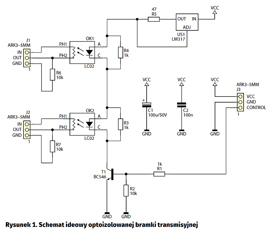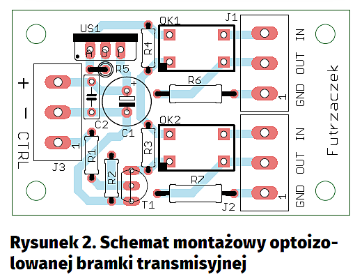 Diody optoizolatorów połączono szeregowo. Ich przewodzenie jest możliwe po wprowadzeniu tranzystora T1 w nasycenie. Aby tak się stało, przez jego bazę musi popłynąć prąd o natężeniu min. 1 mA. To odpowiada podaniu na wejście CONTROL złącza J3 napięcia stałego min. 1,8 V. Umożliwia to załączanie wprost przez mikrokontrolery lub inne układy cyfrowe. Rezystor R2 gwarantuje wyłączenie tranzystora po odłączeniu wejścia CONTROL.
