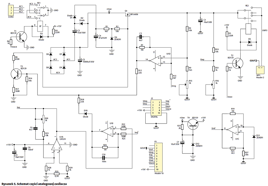 Do zasilania wzmacniacza operacyjnego LM324 oraz sterownika mikroprocesorowego zastosowałem stabilizator napięcia z tranzystorem BD139 i 15-woltową diodą Zenera.