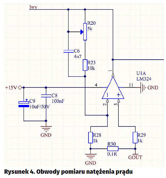 Napięcie wyjściowe powinno być niezależne od spadku napięcia na rezystorze pomiarowym, więc jego próbka w układzie regulacji musi te spadki uwzględniać. Masa GOUT (pokazana na rys. 4) jest jednocześnie ujemnym biegunem napięcia wyjściowego. Dzielnik dzielący napięcie wyjściowe w układzie regulatora jest połączony z tą masą (rys. 2). Powoduje to, że napięcie wyjściowe zasilacza jest niezależne od spadku na rezystorze pomiarowym R30.