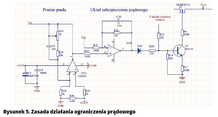 Na rysunku 5 zilustrowano zasadę działania układu zabezpieczenia prądowego. Komparator analogowy porównuje napięcie z wyjścia układu pomiaru prądu z napięciem referencyjnym Ireg określającym natężenie prądu, przy którym układ zaczyna ograniczać napięcie wyjściowe zasilacza. Kiedy napięcie z układu pomiaru prądu próbuje przekroczyć wartość napięcia Ireg, wtedy na wyjściu komparatora U1B występuje napięcie ograniczające napięcie wyjściowe zasilacza. Napięcie wyjściowe jest ograniczane do takiego poziomu, przy którym prąd nie przekroczy ustawionej wartości. Dioda D10 separuje wyjście komparatora od wyjścia układu regulatora napięcia.