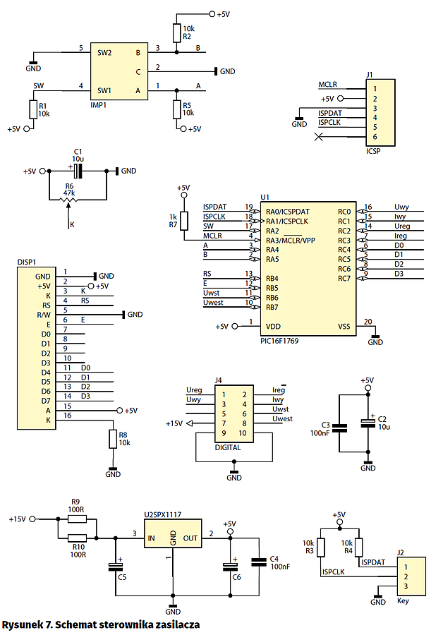 Schemat sterownika pokazano na rysunku 7. Interfejs użytkownika stanowią: alfanumeryczny wyświetlacz LCD DISP1 mieszczący 4×20 znaków oraz impulsator IMP1 ze stykiem zwieranym przez naciśnięcie osi. Złącze J4 (ICD10) jest przeznaczone do doprowadzenia sygnałów sterujących analogowych i cyfrowych z płytki sterownika do płytki analogowej oraz napięcia +15 V zasilającego sterownik. Jest ono podawane poprzez połączone równolegle rezystory R9 i R10 na wejście stabilizatora U2 (SPX1117-5.0) zasilającego sterownik. Spadek napięcia na tych rezystorach jest tak dobrany, aby napięcie na wejściu U2 miało wartości ok. +12 V. Złącze J1 jest przeznaczone dla programatora PICkit-3.