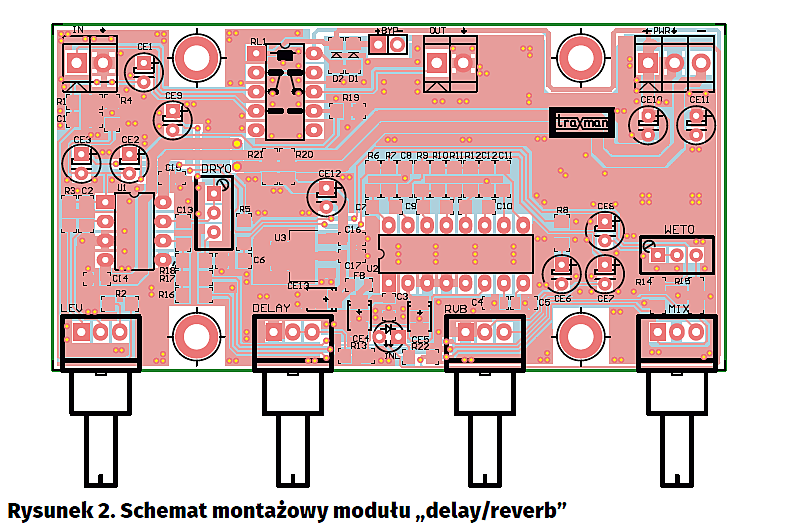 Schemat ideowy modułu pokazano na rysunku 1. Zasada działania jest nieskomplikowana. Do gniazda wejściowego IN jest doprowadzony sygnał obrabiany „DRY”. Podobnie jak w pozostałych modułach, sygnał „BYP” (bypass) doprowadzony do złącza BYP i służy do przełączenia sygnału „DRY” bezpośrednio na wyjście OUT pogłosu, gdy układ jest nieaktywny. Po dopasowaniu poziomu wejściowego we wzmacniaczu U1A (potencjometr LEV), sygnał jest rozdzielony i doprowadzony, kolejno, do układu opóźniającego U2 typu PT2399 i miksera sumującego „DRY/WET” z U1-B. Potencjometr DELAY umożliwia zmianę czasu opóźnienia w zakresie około 40…300 ms. Aby uzyskać efekt „reverb”, część sygnału opóźnionego dostępna na wyprowadzeniu U2-14 jest mieszana z sygnałem wejściowym U2-16. W zależności od ustawienia potencjometru jest możliwe całkowite wyciszenie sygnału opóźnionego – efekt pracuje w trybie „delay”, lub miksowanie umożliwiające uzyskanie efektu „reverb” o różnym poziomie nasilenia.