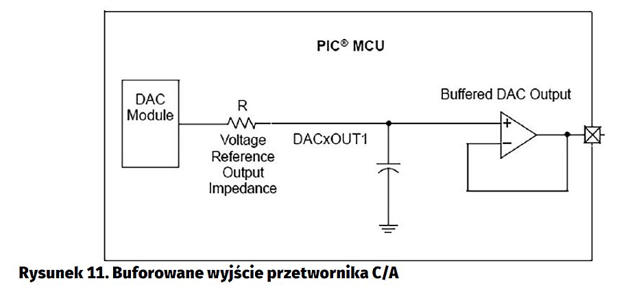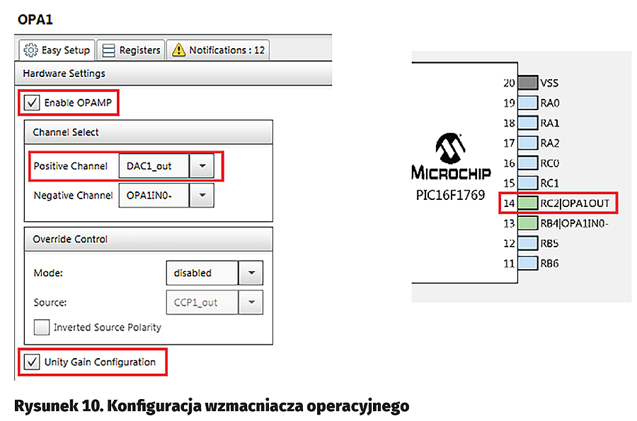 Przed użyciem moduł przetwornika C/A musi być skonfigurowany. Jak już wspomniałem, wszystkie moduły peryferyjne będą konfigurowane za pomocą wtyczki MCC środowiska IDE MPALB X. Konfiguracja przetwornika cyfrowo-analogowego w MCC jest bardzo łatwa. Trzeba włączyć moduł (opcja „Enable DAC”), wybrać dodatnie napięcie referencyjne oraz odblokować wyjście napięcia na wyprowadzenie DACOUT1, jak na rysunku 9. W konfiguracji nie zaznaczono „Enable DACOUT”. Wyjście przetwornika zostanie wewnętrznie połączone z wejściem wbudowanego wzmacniacza operacyjnego pracującego jako bufor. W tym celu należy skonfigurować moduł wzmacniacza operacyjnego, tak aby wejście nieodwracające było połączone z wyjściem przetwornika, jak na rysunku 10. Po zaznaczeniu opcji „Unity Gain Configuration” wzmacniacz zaczyna pracować jako standardowy bufor (rysunek 11). Nie ma wtedy znaczenia, co zostanie wybrane jako sygnał doprowadzony do wejścia odwracającego w konfiguracji wzmacniacza operacyjnego.