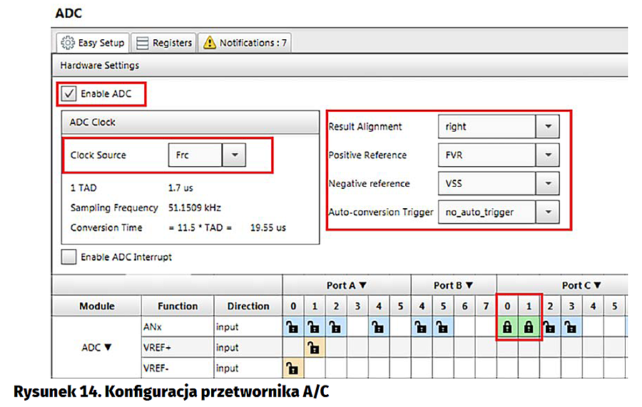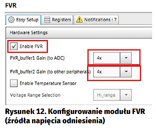 Dla napięcia referencyjnego FVR_Buffer2 równego 4,096 V rozdzielczość wynosi 4,096/1024=4 mV. Napięcie z modułu FVR jest ustawiane z niepewnością 1…2%, a niepewność samego konwertera wynosi ±1,5 LSB. Dla naszego zastosowania jest to zupełnie wystarczające. Zapisanie do przetwornika wartości 1000 powoduje ustawienia napięcia na wyjściu wzmacniacza równego 4 mV×1000=4 V. To upraszcza obliczenia, które musi wykonać mikrokontroler.