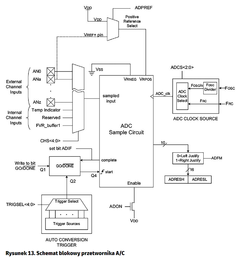 Pomiar napięcia i prądu jest wykonywany przez przetwornik A/C (rysunek 13). W przetworniku zastosowano konwerter SAR. Prędkość konwersji (maksymalnie 100 kSa/s) jest dostosowana do wydajności 8-bitowego rdzenia. Próbkowane napięcie jest doprowadzane przez multiplekser do kondensatora wejściowego o małej pojemności. Po uruchomieniu konwersji jest ustawiany bit bit GO w rejestrze ADCON lub następuje zdarzenie wyzwalające automatycznie konwersję. Kondensator jest odłączany od wejścia i jest wykonywana konwersja analogowo-cyfrowa. Jej wynik jest zapisywany w 16-bitowym rejestrze ADRES. Źródłem taktowania przetwornika może być wewnętrzny oscylator RC (Frc) o stałej częstotliwości ok. 500 kHz. Taki tryb taktowania pozwala na pracę przetwornika w trybie ograniczonego poboru mocy (sleep), kiedy wszystkie przebiegi taktujące są wyłączone. Do taktowania można też użyć podzielonego przebiegu zegarowego rdzenia. Częstotliwość taktująca przetwornik nie była wyższa niż maksymalna częstotliwość taktowania przetwornika (Tad>=1 ms).