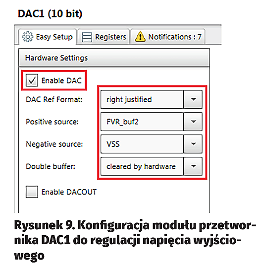 MCC generuje kilka funkcji związanych z obsługą przetwornika DAC1, z których użyjemy tylko dwóch: pokazanej na listingu 1 DAC1_Initialize(void) oraz DAC1_Load10bitInputData(uint16_t input10BitData) z listingu 2.
