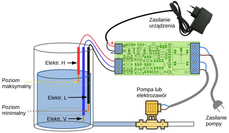 Urządzenie wymaga zamontowania w zbiorniku trzech przewodów z odizolowanymi końcówkami. Pierwszy będzie pełnił funkcję elektrody głównej (dalej będzie nazywany elektrodą V) i powinien być umieszczony najgłębiej ze wszystkich, tak by zawsze był zanurzony. Drugi przewód (elektroda L) musi sięgać do poziomu zbiornika, który ustalimy poziomem minimalnym i musi znajdować się powyżej końca elektrody V. Trzeci przewód (elektroda H) musi sięgać do poziomu zbiornika, który ustalimy poziomem maksymalnym i musi znajdować się powyżej końca elektrody L.
