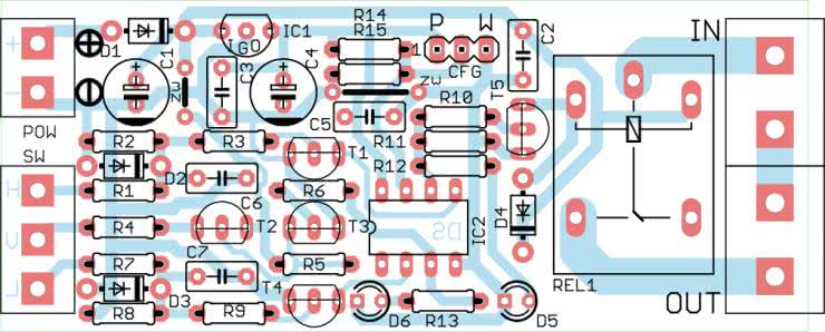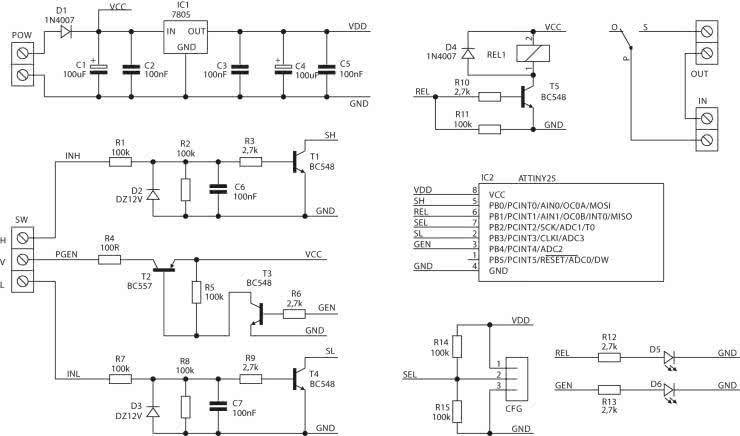 Schemat ideowy urządzenia pokazano na rysunku 1. Podzielony jest na kilka nieskomplikowanych bloków. Złącze oznaczone POW służy do dołączenia zasilania urządzenia. Wartość tego napięcia powinna wynosić ok. 12 V, a wydajność prądowa przynajmniej 0,2 A. Złącze SW służy do przyłączenia trzech przewodów – elektrod „H”, „V” i „L”. Złącza IN oraz OUT to obwód wykonawczy, służą do przyłączenia zasilania do odbiornika (IN) oraz odbiornika (OUT). Obwód wykonawczy umożliwia dołączenie zaworu elektromagnetycznego z zasilaniem 24 V DC lub pompy zasilanej 230 V AC albo dowolnego innego urządzenia o mocy nieprzekraczającej 1 kW.