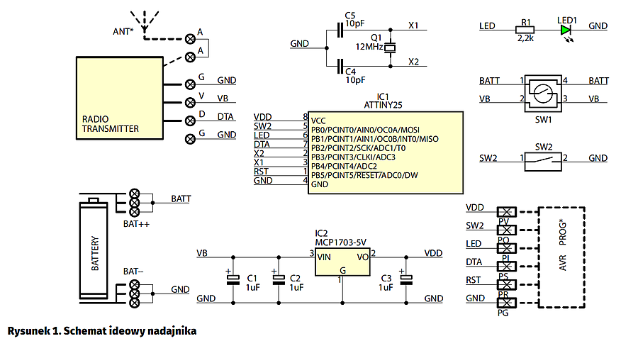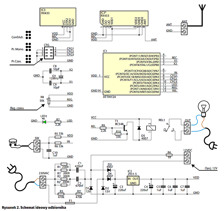 Drugą częścią urządzenia jest moduł wykonawczy – odbiornik. Jego ideowy pokazano na rysunku 2. Blok zasilania tworzy zasilacz beztransformatorowy z kondensatorami C1 i C2, zatem urządzenie można zasilać bezpośrednio z sieci energetycznej poprzez złącze opisane „230 VAC”. Jest ono zabezpieczone bezpiecznikiem F1 wlutowanym w płytkę, który zadziała w wypadku przepięcia w sieci lub awarii urządzenia. Opcjonalnie, urządzenie można zasilać napięciem stabilizowanym +12 V DC dołączonym do złącza „12 VDC” (polaryzacja nieistotna). Rolę bezpiecznika pełni tu rezystor małej mocy R4, który ulegnie uszkodzeniu w przypadku zasilania wyższym napięciem lub awarii urządzenia.