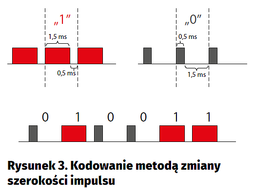 Do komunikacji radiowej urządzenie wykorzystuje sygnał modulowany metodą ASK (Amplitude Shift Keying) lub inaczej, bardziej intuicyjnie – OOK (On-Off Keying). Zatem komunikaty nadawane przez pilot to ciągi impulsów, czyli momentów nadawania sygnału i przerw pomiędzy nimi. Czasy trwania tych stanów mają istotne znaczenie – w ten sposób jest zakodowana informacja. Nie chodzi jednak o szyfrowanie, a o takie przekształcenie danych, które pozwoli na ich przesłanie drogą radiową. W urządzeniu zastosowano metodę zmiany szerokości impulsu, której działanie obrazuje rysunek 3.