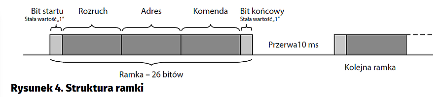 Dane, które są przesyłane to zwykle wartość identyfikująca urządzenie (adres) oraz polecenie (komenda). Niezbędne są także elementy pomocnicze pozwalające na pewniejszy odczyt danych i unikanie błędów. Zakodowany pakiet danych zawierający te wszystkie elementy będzie nazywany ramką. Ramka w opisywanym urządzeniu, składa się z 26 impulsów, w których jest zawarty jeden bit startu, następnie jeden bajt tzw. rozruchowy, bajt adresu, bajt komendy i jeden bit końcowy, jak na rysunku 4. Kolejne ramki oddzielone są przerwą 10 ms.