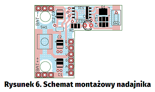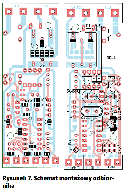 Schemat montażowy nadajnika pokazano na rysunku 6, natomiast odbiornika na rysunku 7. Montaż urządzenia nie jest łatwy, ponieważ elementy są gęsto rozmieszczone i w obudowach do montażu powierzchniowego. Dodatkowo, odbiornik może być zasilany napięciem niebezpiecznym dla człowieka, więc montaż musi być wykonany profesjonalnie.
