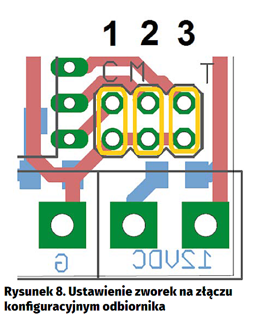 Po ustawieniu adresu można jeszcze ustawić tryb pracy odbiornika. Założenie zworki w pozycji 2 wymusza pracę monostabilną, czyli wyjście będzie załączone tak długo, jak długo będzie wciśnięty przycisk w nadajniku. Założenie zworki w pozycji „3” wymusza pracę bistabilną z automatycznym wyłączaniem czasowym. Czas może być regulowany potencjometrem R8 w zakresie od kilku sekund do ok 10 min. Brak zworki wymusi pracę bistabilną – każde naciśnięcie przycisku zmieni stan przekaźnika na przeciwny.
