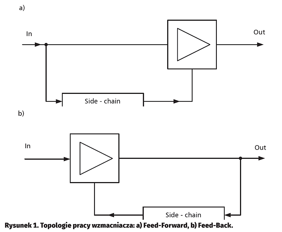 Kompresor jest oparty na układzie wzmacniacza o regulowanym napięciowo wzmocnieniu w topologii Feed-Forward (rysunek 1a), tj. sygnał sterujący układ VCA, przygotowany w obwodzie regulacji (side-chain), jest pobierany bezpośrednio z wejścia kompresora, w odróżnieniu od topologii Feed-Back (rysunek 1b), gdzie jest pobierany z wyjścia kompresora.