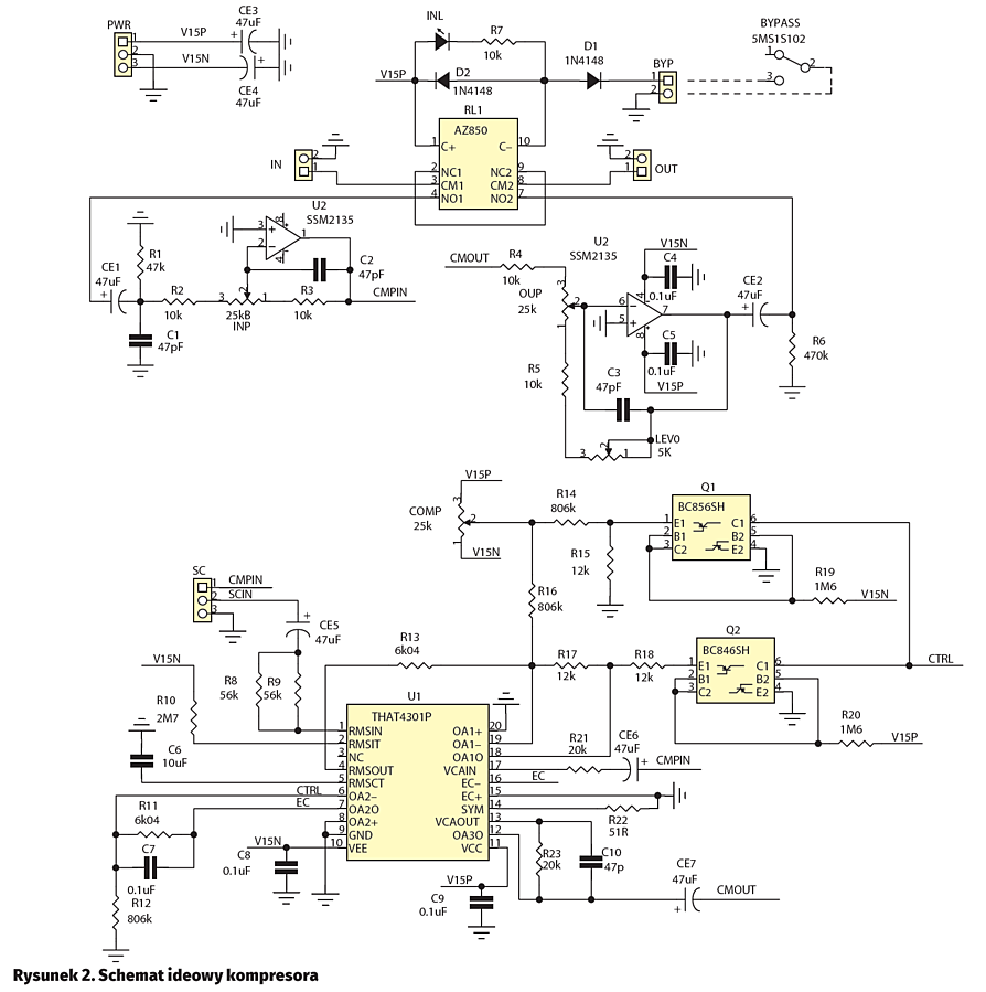 Schemat ideowy modułu kompresora pokazano na rysunku 2. Sygnał wejściowy z gniazda „IN” jest doprowadzony do stopnia o regulowanym wzmocnieniu opartym na wzmacniaczu U2-1. Układ umożliwia dopasowanie czułości wejściowej potencjometrem „INP”. Podczas pracy poziom wejściowy (czułość) jest ustalany jednorazowo na wartość sygnału na wejściu VCAIN kompresora na ok. -10 dB. Przekaźnik RL1 umożliwia załączenie funkcji „Bypass” kompresora przekazując sygnał z wejścia na wyjście bez jakiejkolwiek zmiany, gdy kompresor jest pozbawiony zasilania (ułatwia to budowę torów szeregowych) lub gdy jest wyłączony przełącznikiem „BYPASS” doprowadzonym do złącza BYP. Prace kompresora w torze audio sygnalizuje dioda „INL”.