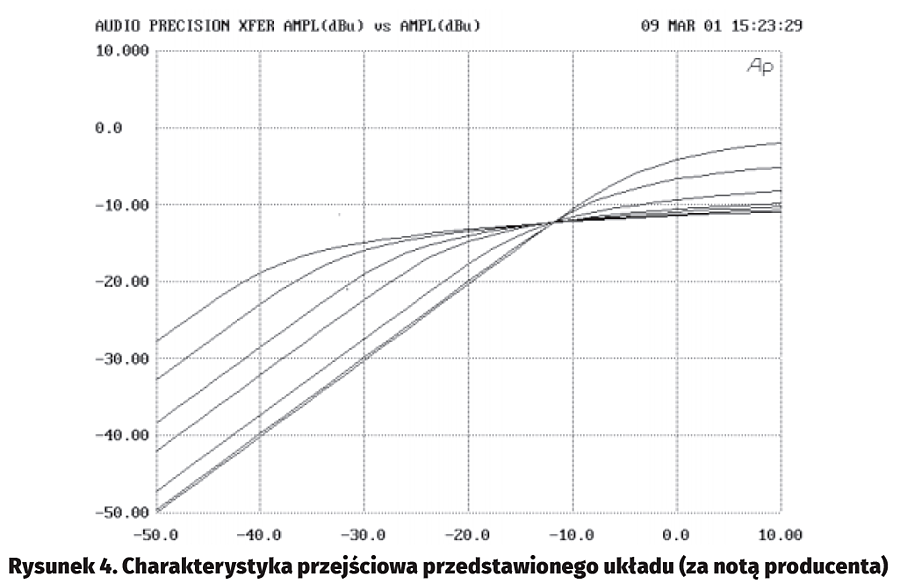 Regulacje odpowiedzialne za „poziom” sygnału w typowym kompresorze są powiązane. Na przykład, zwiększenie współczynnika kompresji (Ratio) lub obniżenie progu zadziałania (Threshold) powoduje obniżenie poziomu wyjściowego (Output). Aby utrzymać poziom wyjściowy, po kompresji jest konieczne każdorazowe jego wyrównanie (MakeUp). Taka procedura bywa uciążliwa, gdy zależy nam na możliwie szybkiej zmianie parametrów. Regulacja wymaga kilku prób dla uzyskania oczekiwanego efektu. W nocie aplikacyjnej dn115 przedstawiono aplikację układu, w której interakcje są ograniczone do minimum, a do obsługi kompresora wystarcza pojedynczy potencjometr. Układ samodzielnie koryguje zmiany poziomów. Charakterystyka przejściowa w zależności od ustawienia potencjometru „COMP” układu jest zamieszczona na rysunku 4.