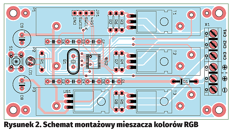 Schemat montażowy mieszacza kolorów RGB pokazano na rysunku 2. Wszystkie elementy urządzenia są w obudowach do montażu przewlekanego, za wyjątkiem mikrokontrolera US2. Dla ułatwienia montażu powinien on być wlutowany jako pierwszy, a kolejne komponenty po upewnieniu się, że montaż przeprowadzony został poprawnie. Na końcu należy wlutować potencjometry. Dla zapewnienia zwartej konstrukcji urządzenia, potencjometry znajdują się ponad pozostałymi elementami.