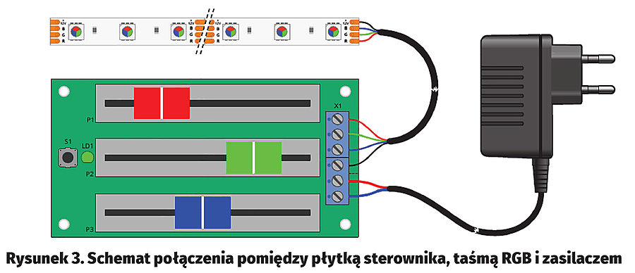 Najpierw do gniazd X1-4, X1-5, X1-6 należy doprowadzić wyprowadzenia katod 3 kolorów diod LED zamontowanych na taśmie. Anody wszystkich diod taśmy powinny być połączone z jednym, wspólnym wyprowadzeniem, które należy podłączyć do gniazda X1-3. Ponieważ do zasilania taśm stosowane jest napięcie stałe +12V, plus napięcia podłączamy do gniazda X1-2 a masę do X1-1. Na rysunku 3 pokazano schemat połączenia pomiędzy płytką sterownika, taśmą RGB i zasilaczem.