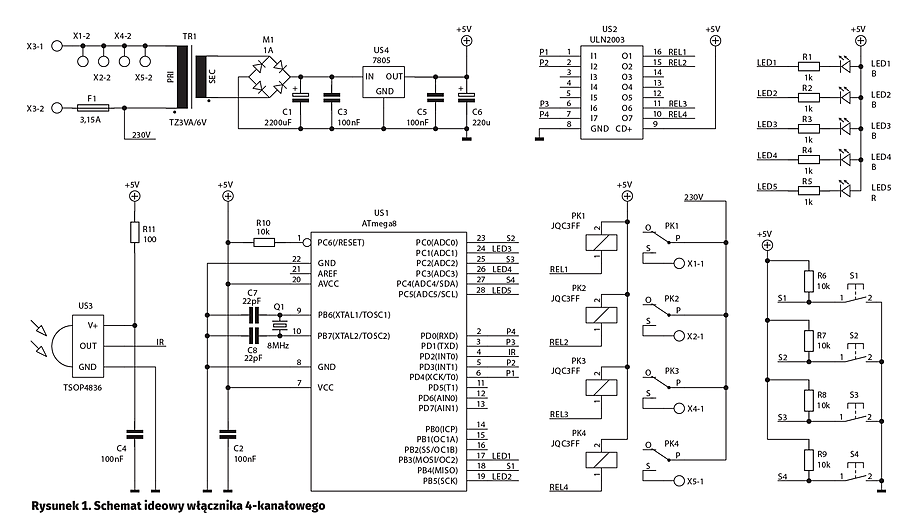 Jako stopień wyjściowy dla poszczególnych kanałów przełącznika zastosowano układ (US2) typu ULN2003A, który zawiera 7 stopni wzmacniaczy tranzystorowych z diodami zabezpieczającymi umożliwiającymi bezpośrednie sterowanie przekaźnikami.