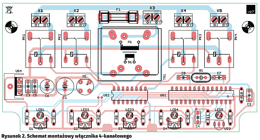 Schemat montażowy płytki drukowanej pokazano na rysunku 2. W materiałach dodatkowych można znaleźć wzory płytek drukowanych, które można wykorzystać jako panel czołowy i tylny. Szczegóły montażu przedstawiają załączone fotografie. Płytkę dopasowano do obudowy Z4 – jej wymiary to 74 mm×145 mm. Montaż głównego obwodu drukowanego jest typowy i nie wymaga dodatkowego szczegółowego opisu. Jedynie wyprowadzenia diod LED należy zagiąć tak, aby znajdowały się nad kątowymi mikroswitchami i dało się je przełożyć przez przedni panel. Dwa pola lutownicze na płytce głównej warto połączyć lutowiem z polami na płycie czołowej. Pozwoli to na pewne zainstalowanie płytek w obudowie. Dodatkowo płytka główna ma otwory montażowe dopasowane do słupków w obudowie służące do przykręcenia. Na panelu tylnym najlepiej zamontować 4 gniazda typu GS-035. Ich montaż odbywa się za pomocą jednego wkręta. Płytkę główną (X1, X2, X4, X5) ze wspomnianymi gniazdami należy połączyć przewodami o przekroju min. 1,5 mm2. Są to gniazda bez uziemienia i pozwalają na dołączenie urządzenia z przewodami zakończonymi płaską wtyczką. Na tylnym panelu znajduje się również miejsce na wyłącznik oraz otwór na przewód zasilający. Przełącznik należy włączyć w obwód przewodu zasilającego, a wolne końce do gniazda śrubowego X3. Bezpiecznik znajduje się wewnątrz urządzenia i przed ewentualną wymianą należy pamiętać o odłączeniu urządzenia od sieci. Obciążenie pojedynczego kanału/gniazda wynosi do 150 W.