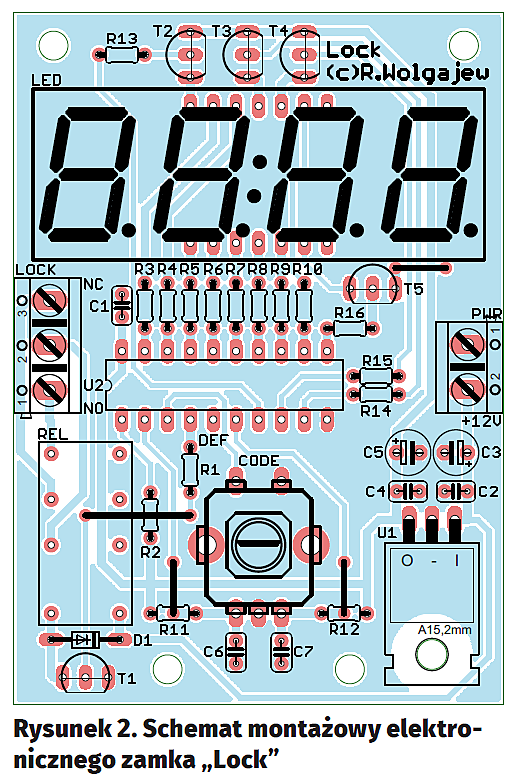 Na rysunku 2 pokazano schemat montażowy płytki zamka elektronicznego. Montaż należy rozpocząć od wlutowania 4 zworek, których położenie zaznaczono graficznie na obwodzie drukowanym. Następnie lutujemy rezystory i kondensatory, kolejno elementy półprzewodnikowe, a na samym końcu elementy mechaniczne, jak złącza PWR i LOCK, przekaźnik REL oraz enkoder CODE. Podczas montażu wyświetlacza LED należy odsunąć go od powierzchni płytki urządzenia o około 2 mm, aby górna powierzchnia jego obudowy znajdowała się na tym samym poziomie, co górna powierzchna obudowy przekaźnika REL.