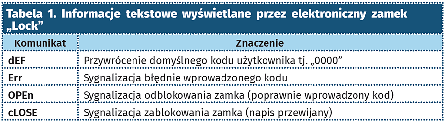 Wprowadzenie poprawnego kodu powoduje odblokowanie zamka (i stosowną reakcję przekaźnika), zaś błędnego, przejście do trybu bezczynności urządzenia w oczekiwaniu na wprowadzanie nowego kodu odblokowującego. Pozostawanie w trybie wprowadzania kodu użytkownika (migająca pierwsza cyfra od prawej) i nieukończenie tego procesu w czasie 5 s powoduje wyjście do trybu bezczynności urządzenia. Czas ten liczony jest każdorazowo od nowa po dokonaniu jakiejkolwiek edycji. Ponadto, w celu sygnalizacji stanu pracy, urządzenie wyświetla kilka informacji tekstowych, których zestawienie, łącznie z ich znaczeniem, umieszczono w tabeli 1.
