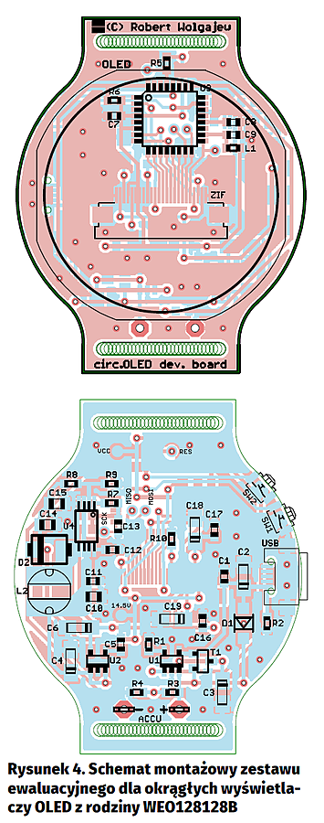 Schemat montażowy zestawu ewaluacyjnego pokazano na rysunku 4. Zaprojektowano niewielką płytkę drukowaną, która swoim kształtem przypomina zegarek naręczny, dając możliwość zamocowania typowego paska utrzymującego ją na nadgarstku. Z uwagi na fakt, że moduł wyświetlacza OLED jest dołączony do płytki z użyciem gniazda ZIF o bardzo gęstym rastrze (0,5 mm), montaż płytki ewaluacyjnej rozpoczynamy właśnie od przylutowania tego gniazda. Najprostszym sposobem montażu elementów o tak dużym zagęszczeniu wyprowadzeń, niewymagającym jednocześnie posiadania specjalistycznego sprzętu, jest użycie typowej stacji lutowniczej, dobrej jakości cyny z odpowiednią ilością topnika oraz dość cienkiej plecionki rozlutowniczej, która umożliwi usunięcie nadmiaru cyny spomiędzy wyprowadzeń złącza. Należy przy tym uważać, by nie uszkodzić termicznie tego elementu. Jakość tak wykonanego połączenia sprawdzamy pod lupą, korzystając z miernika pozwalającego sprawdzić ciągłość połączeń. Wspomniana kontrola będzie znacznie łatwiejsza, jeśli płytkę przemyjemy alkoholem izopropylowym w celu wypłukania nadmiaru kalafonii lutowniczej. Następnie lutujemy mikrokontroler oraz wszystkie elementy bierne przeznaczone do montażu na warstwie TOP obwodu drukowanego.