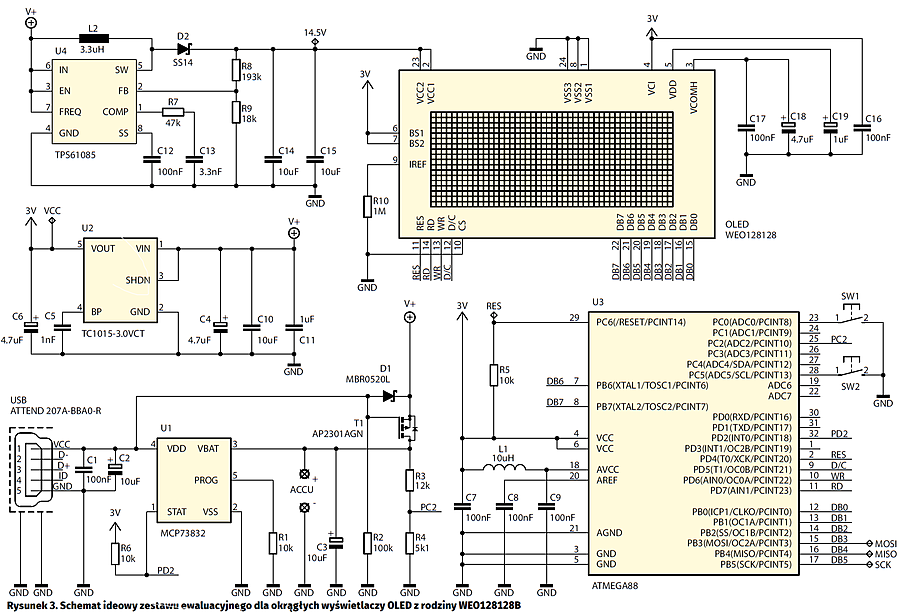 Dodatkowo, wyświetlacz potrzebuje napięcia rzędu 14,5 V zasilającego panel OLED, więc w bloku zasilającym tenże panel wykorzystano nowoczesną przetwornicę typu step-up o oznaczeniu TPS61085 firmy Texas Instruments. Przetwornica ta odznacza się doskonałymi parametrami elektrycznymi: sprawność dochodząca do 93%, szeroki zakres napięcia wejściowego (2,3…6 V), miękki start, wbudowane zabezpieczenia (termiczne, przed spadkiem napięcia), częstotliwość przełączania 1,2 MHz. Dodatkowo układ TPS61085 ma wejście EN (Enable), za którego pomocą możemy wyłączyć przetwornicę, jeśli zajdzie taka potrzeba (np. wygaszenie wyświetlacza) i tym samym ograniczyć pobór prądu ze źródła napięcia zasilającego. W celu uczynienia naszego zestawu jeszcze bardziej uniwersalnym, na schemacie urządzenia dodano dwa, uniwersalnie mikroprzyciski oznaczone SW1/SW2 przeznaczone do dowolnego wykorzystania przez aplikację użytkownika.