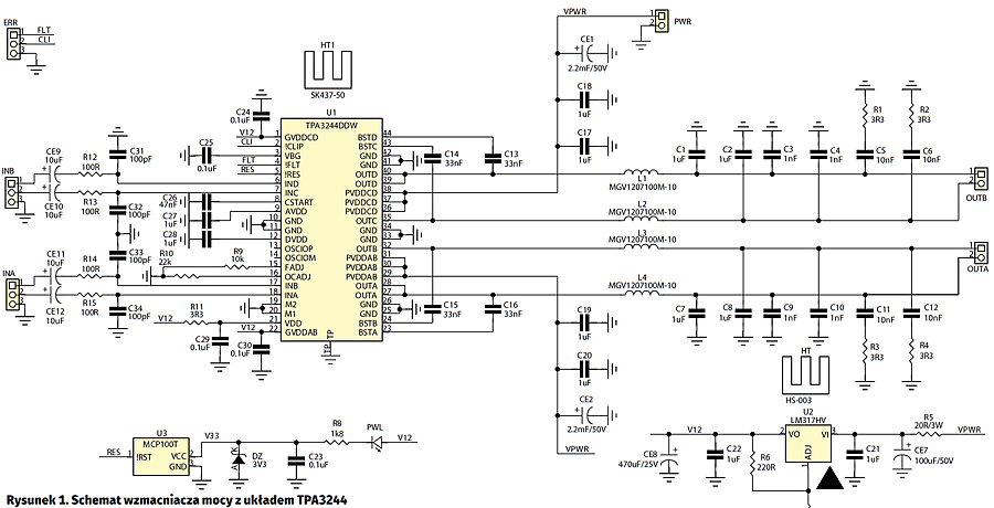 Schemat ideowy wzmacniacza pokazano na rysunku 1. Układ TPA3244 pracuje zgodnie z notą aplikacyjną. Skonfigurowano go jako dwukanałową końcówkę w topologii BTL (wzmacniacz mostkowy) przez podanie poziomu niskiego na wyprowadzenia M1 i M2. Kanały są oznaczone „A” i „B”. Sygnał wyjściowy przed doprowadzeniem do zacisków wyjściowych OUTA/OUTB jest poddawany filtracji dolnoprzepustowej za pomocą dławików L1…L4 i kondensatorów C1…C4, C7…C10. Ze względu na duże natężenie prądu wyjściowego oraz impulsowy charakter pracy dobór elementów filtrujących jest krytyczny. W modelu zastosowano cewki na rdzeniach proszkowych Laird MGV-1207 oraz metalizowane kondensatory polipropylenowe MKP Epcos, co minimalizuje straty i pozwala na zachowanie bardzo dobrej jakości sygnału. Filtr wyjściowy oraz kondensatory sprzęgające są dobrane arbitralnie do współpracy z obciążeniem z zakresu 6…8 V.