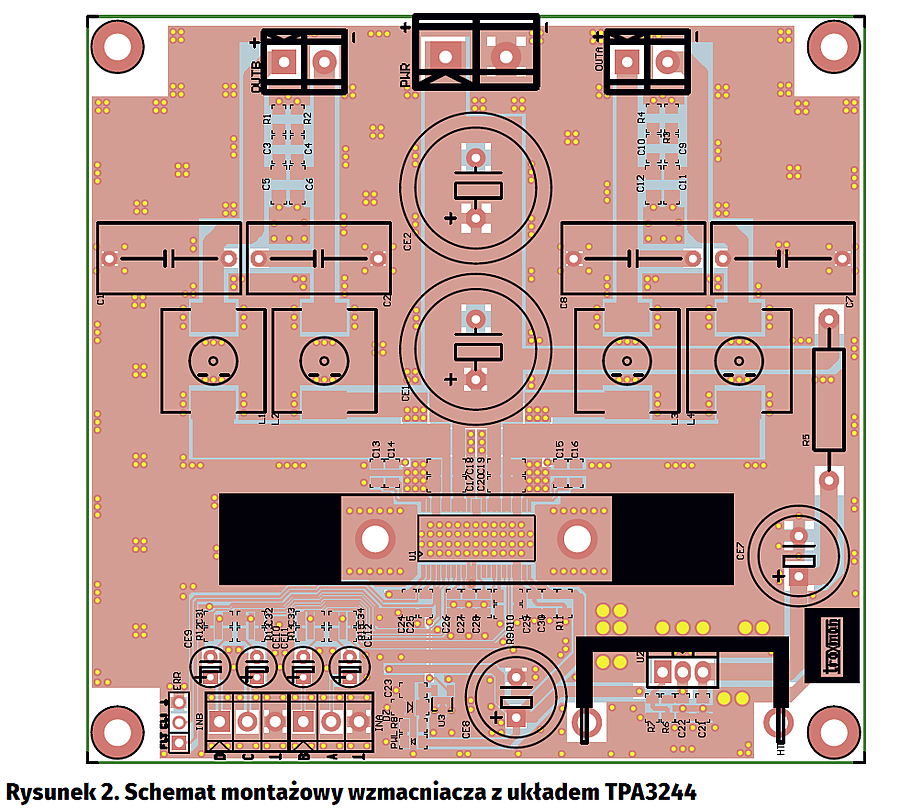 Ze względu na traconą moc układ U1 ma pad termiczny przylutowany do warstwy masy płytki drukowanej. Przy forsownej pracy warto wyposażyć TPA3244 w dodatkowy radiator np. SK437-50 przymocowany od „góry” za pomocą śrub M3 i dwustronnej, samoprzylepnej taśmy termoprzewodzącej. Należy zwrócić uwagę na wysokość elementów w otoczeniu układu U1, aby nie dopuścić do zwarcia z radiatorem poprzez wykonanie odpowiednich podfrezowań w jego krawędziach w wypadku trudności z zakupem elementów SMD o obniżonej wysokości. W razie forsownej pracy lub wysokiej temperatury otoczenia można wymusić dodatkowy przepływ powietrza wentylatorem.
