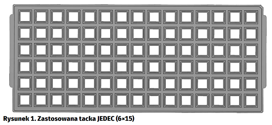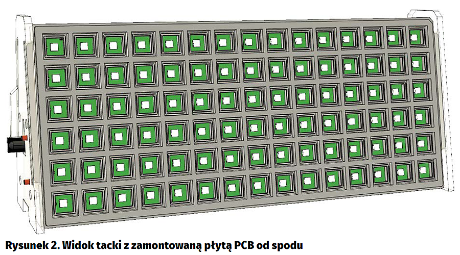 Obudowa zegara i samego wyświetlacza składa się z dwóch głównych części. Pierwsza to panel wyświetlacza, do którego budowy użyłem tacki typu JEDEC pod układy scalone w obudowach TQFP, QFN o wymiarach okienka 14 mm×14 mm. „Pojemność” tacki wynosi 6×15 okienek, więc może ona pomieścić 90 układów (rysunek 1). Zwykle tacki tego typu są utylizowane przez firmy produkcyjne, które zamawiają układy scalone do montażu płytek PCB. Tymczasem można je zastosować jako kratownicę, która będzie pełniła podwójną rolę w naszym wyświetlaczu. Przede wszystkim, umieszczając z tyłu płytkę PCB z odpowiednio rozstawionymi i zamontowanymi diodami LED uzyskamy idealne blokowanie światła każdego piksela wyświetlacza. Dzięki odpowiednio wykonanej płytce drukowanej, diody LED będą zamontowane pośrodku każdego z otworków, a jednocześnie płyta PCB będzie dociśnięta do tacki (rysunek 2).