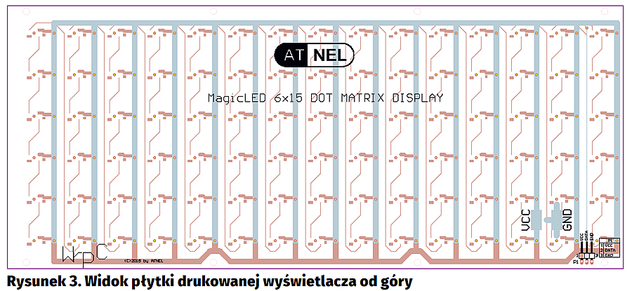 Istotnym elementem panelu wyświetlacza jest również sama płyta PCB zawierająca jedynie diody Magic LED. Z uwagi na dużą liczbę diod (aż 90 sztuk) i w związku z tym możliwość maksymalnego poboru prądu ok 5,4 A, musi ona być specjalnie zaprojektowana. Projektując płytkę uwzględniono nie tylko odpowiednie szerokości ścieżek zasilania, ale także sporą liczbę metalizowanych przelotek oraz dwustronne prowadzenie ścieżek (rysunek 3 i rysunek 4). Umożliwia to bezstratne doprowadzenie napięcia zasilania +5 V od pierwszej do ostatniej diody w łańcuchu, a spora ilość miedzi pełni również rolę radiatora, co umożliwi odprowadzenie ciepła, które może wydzielać się, gdy np. cały wyświetlacz będzie świecił światłem białym o maksymalnym natężeniu.