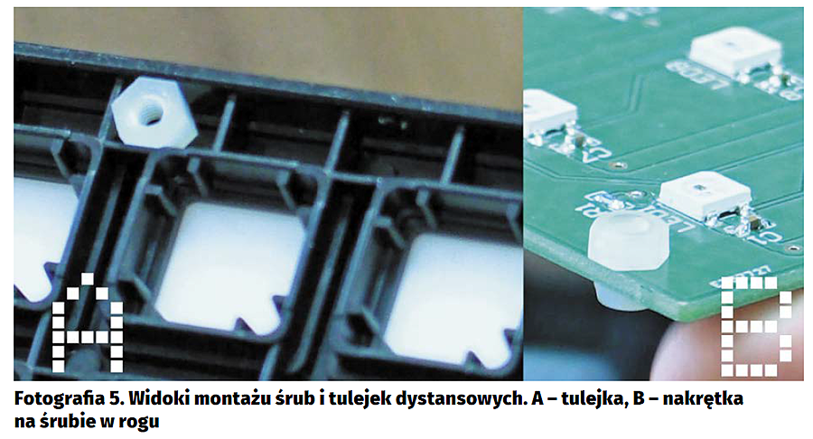 Płytę PCB zaopatrzono w 8 otworów montażowych o średnicy 3,2 mm. Mocowanie do tacki zapewniają plastikowe śruby o średnicy 3 mm. Wybrano je z uwagi na łatwość przycięcia ich za pomocą szczypiec do pożądanej długości. Cztery śruby w każdym z narożników mają nakręcone plastikowe nakrętki i zostały przycięte tak, aby śruba nie wystawała ponad nakrętkę. Otwory na obrzeżach tacki pozwalają na wciśnięcie sześciokątnych nakrętek nieco na siłę, co już zapewnia wstępny zaczep PCB do tacki. Dla wzmocnienia użyto czterech sześciokątnych, plastikowych tulejek dystansowych, które przycięto na wysokość około dwóch nakrętek, ponieważ taką głębokość mają otwory w tackach. Tym razem, przycięte fragmenty tulejek dystansowych zostały solidnie wciśnięte w otwory tacki za pomocą niewielkiego młotka. Umieszczono je dokładnie pod czterema otworami na śruby w środkowej części płyty PCB. Ilustruje to fotografia5. Dzięki temu po wstępnym jej zatrzaśnięciu na cztery zewnętrzne nakrętki w każdym z rogów, dodatkowo można wkręcić cztery śruby na brzegach PCB bliżej środka, do wciśniętych uprzednio tulejek dystansowych. Taki sposób połączenia płyty PCB zapewnia solidną budowę, która z jednej strony chroni przed przypadkowym wypadnięciem płyty PCB podczas wstrząsu lub upadku, a z drugiej strony zapewnia łatwy dostęp w razie konieczności wymiany uszkodzonej diody LED.