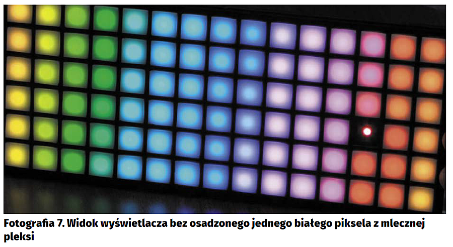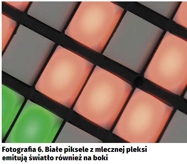 Białe kwadraty pleksi (piksele) pełnią bardzo ważną rolę. Główny cel to rozpraszanie światła emitowanego przed diody LED. Dodatkowo, uzyskujemy delikatną emisję światła na bocznych ściankach kwadratów (fotografia6). Tu polecam eksperymentowanie również z innymi grubościami mlecznej pleksi np. 5 mm, albo jeszcze grubszej. Może to przynieść zaskakująco pozytywne efekty. Widok płytki wyświetlacza bez osadzonego mlecznego kwadratu z pleksi pokazano na fotografia7.