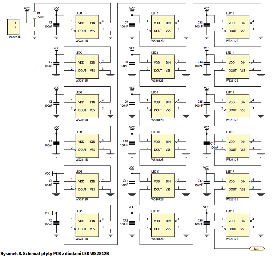Schemat ideowy wyświetlacza pokazano na rysunku8. Pragnę zwrócić w tym momencie uwagę na kilka istotnych szczegółów z punktu widzenia prawidłowego działania łańcucha diod, ponieważ z takim mamy tu do czynienia. Linia sygnałowa rozpoczyna się osadzonym szeregowo rezystorem o oporności 270 V, który stanowi istotne zabezpieczenie linii sygnałowej przed przepięciami i impulsami, które mogłyby wpłynąć na zakłócenia pracy całego łańcucha tych „inteligentnych” diod. Poza tym, każda dioda jest zaopatrzona we własny kondensator filtrujący zasilanie o pojemności 100 nF. Brak tych kondensatorów mógłby wpłynąć na zakłócenia pracy diod. Muszą one być umieszczone możliwie jak najbliżej wyprowadzeń diod na PCB. Oczywiście z uwagi na liczbę diod w całym łańcuchu na schemacie umieszczono tylko kilkadziesiąt pierwszych diod.
