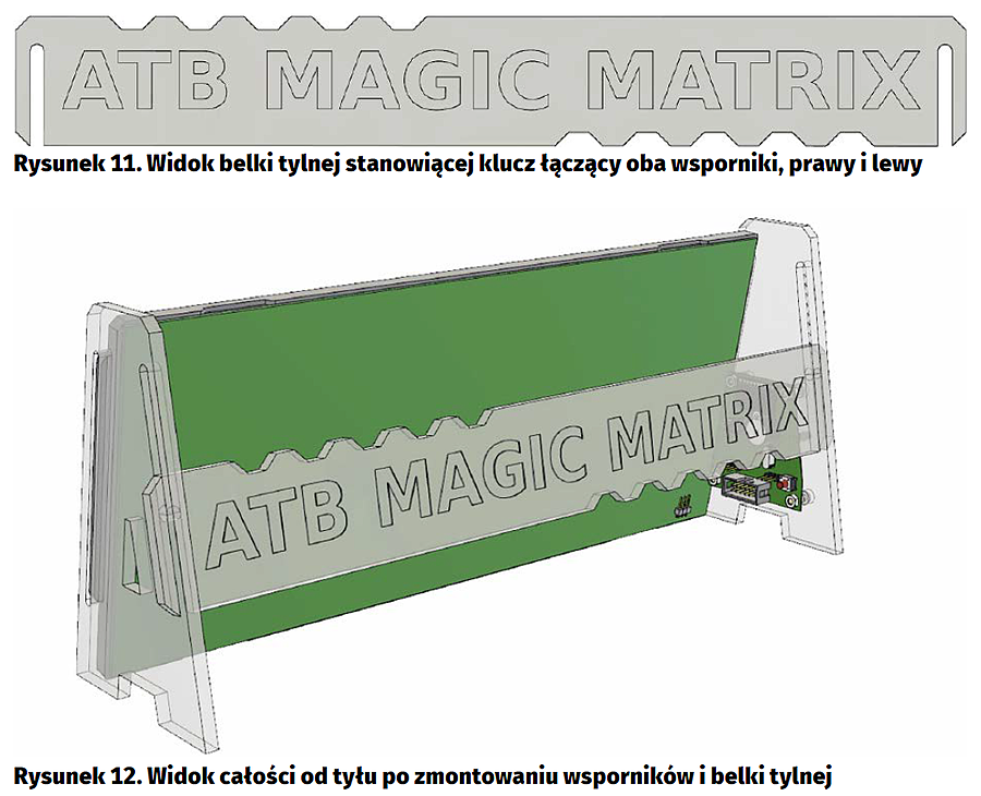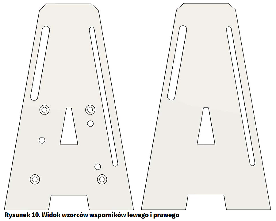 Jak pokazano na rysunku 10, każdy ze wsporników ma dwie szczeliny: jedną dłuższą służącą do osadzenia skrzydełek tacki modułu wyświetlacza oraz drugą krótszą służącą do osadzenia belki tylnej przeznaczonej do wzmocnienia całej konstrukcji. Belkę pokazano na rysunku 11, z którego widać, że jest ona mocowana na tzw. zakładkę w oba wsporniki, a następnie przesuwana w dół. Taka budowa zapewnia maksymalną stabilność całości, solidną obudowę, przy możliwie minimalnej prostocie jej wykonania w amatorskich warunkach. Jeden z wzorców wspornika lewego posiada także przygotowane miejsca do wiercenia otworów zarówno pod śruby montażowe do płyty PCB sterownika urządzenia a także otworów, przez które zostaną wyprowadzone zostaną przyciski służące do nastaw urządzenia.