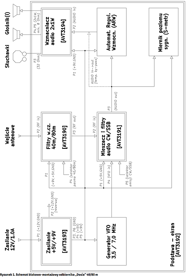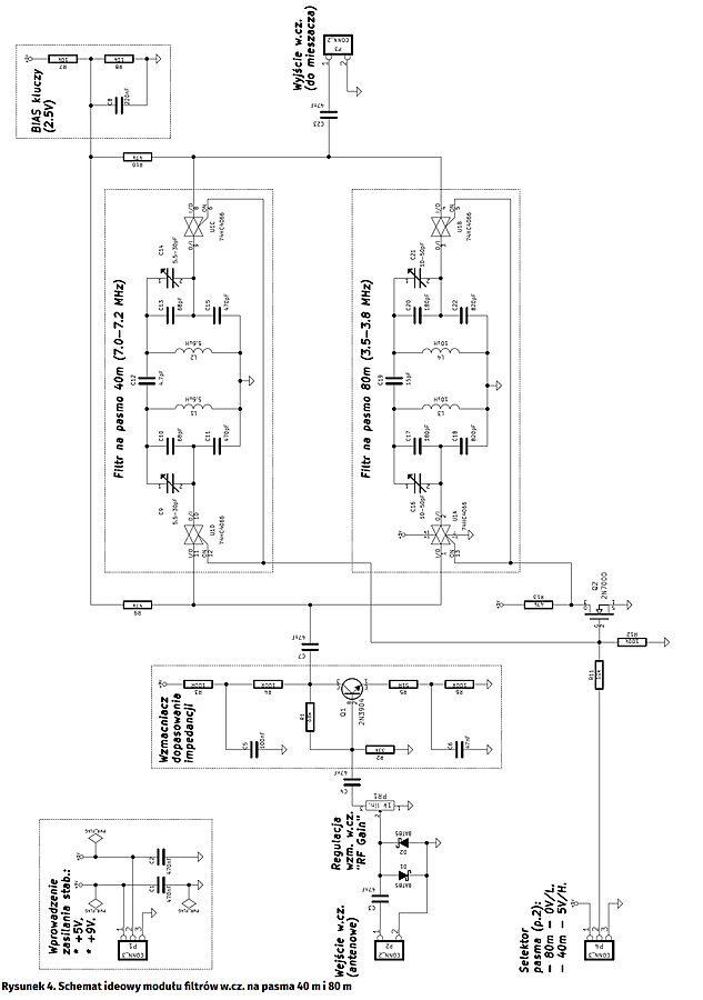 Kluczowym zadaniem wzmacniacza z tranzystorem Q1 jest zapewnienie stałego dopasowania impedancyjnego na wejściu właściwych filtrów w.cz. Jego zastosowanie zostało podyktowane faktem, że znacznie zróżnicowane impedancje potencjalnych anten odbiorczych (w praktyce: od kilku omów dla anten bardzo krótkich, do kilkuset i więcej omów dla długich anten drutowych typu LW, czyli „Long Wire”) powoduje pogorszenie dopasowania między anteną a zestrojonym na stałe filtrem i – w konsekwencji – popsucie poprawnie ustalonych charakterystyk przenoszenia filtru. Sygnał ze wzmacniacza z tranzystorem Q1, przez szeregowe sprzężenie C7 jest podawany na klucze półprzewodnikowe U1D i U1A w układzie 74HC4066, które przełączają go między wejściami filtrów na pasmo 40 m oraz 80 m. Druga para kluczy z tego samego układu (U1C i U1B) odbiera sygnał z wybranego filtru i przez kondensator sprzęgający C23 przekazuje go na wyjście omawianego modułu (port P3).