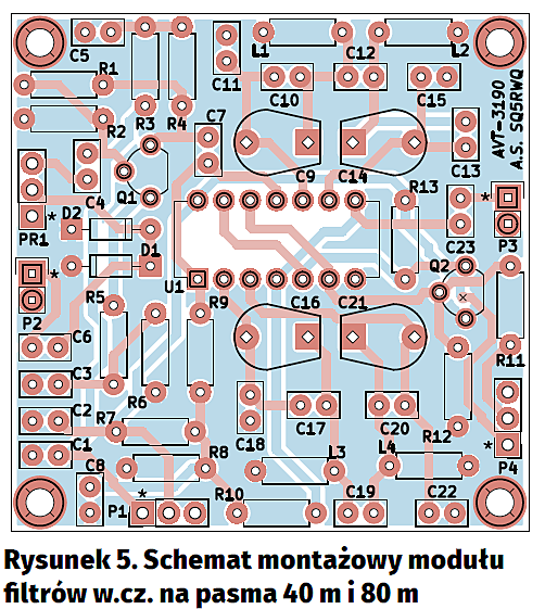 Na rysunku 4 pokazano schemat elektryczny modułu filtrów pasmowych w.cz. (AVT3190). Odbiornik „Dosia”, z uwagi na swą znaczną odporność na przesterowanie i intermodulację, w zasadzie jest w stanie pracować bez tego bloku, jednak w niekorzystnych warunkach zakłóceniowych jego brak może znacząco utrudniać poprawny, czysty odbiór.