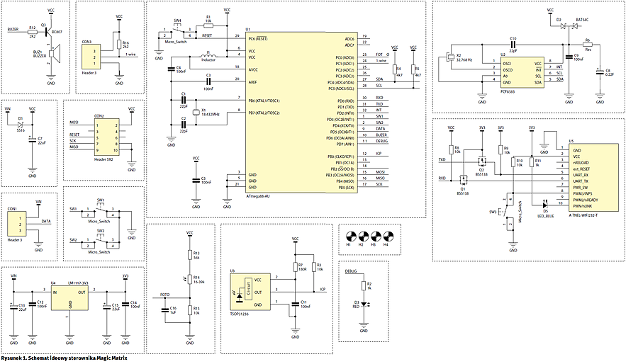 Linie interfejsu I2C podciągnięto do VCC za pomocą rezystorów R4 i R5, każdy o rezystancji 4,7 kV. Wokół mikrokontrolera wydzielono moduły poszczególnych peryferiów dla lepszej analizy schematu. W lewym górnym rogu rys. 1 widać buzzer z generatorem, który jest sterowany z jednej z linii mikrokontrolera za pomocą tranzystora małej mocy BC807 z uwagi na to, że sam buzzer pobiera podczas normalnej pracy nieco większy prąd niż wynosi wydajność prądowa pinu mikrokontrolera. Tym sposobem dbamy również o zmniejszenie zakłóceń na pinach zasilania samego mikrokontrolera, które mogą być przecież generowane również przez sam mikrokontroler, przez jego wewnętrzne układy, a w szczególności wyjściowe porty cyfrowe, które musiałyby przełączać większe obciążenia.
