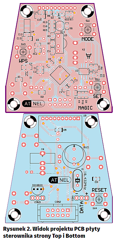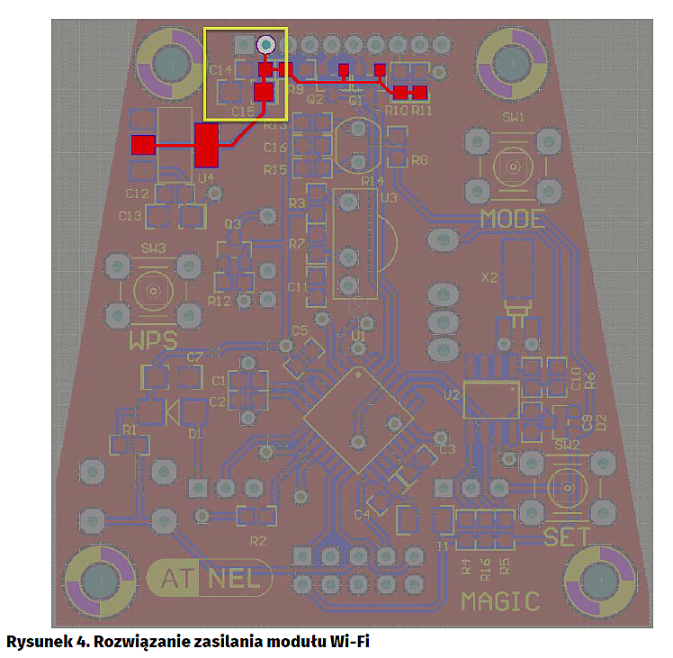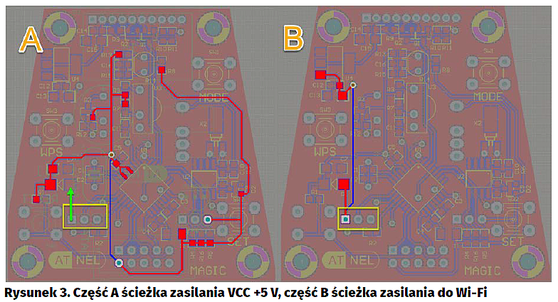 Na rysunku 3 pokazano projekt płytki drukowanej z zaznaczonym projektem ścieżek zasilania. W części „A” pokazano obwód zasilania VCC, który dzieli się na trzy gałęzie. Jedna doprowadza zasilanie VCC w górę płytki do odbiornika podczerwieni i buzera, druga gałąź (na środku) jest przeznaczona tylko na potrzeby mikrokontrolera. Przy czym tuż przed samymi pinami zasilania mikrokontrolera osadzony jest kondensator filtrujący zasilanie 10 mF. Trzecia gałąź biegnąca w dół od diody D1, dociera poprzez złącze programatora KANDA, do układu RTC oraz fotorezystora. Po lewej stronie rysunku, w części „B” pokazano ścieżkę zasilania prowadzoną oddzielnie do stabilizatora 3,3 V, który służy jedynie na potrzeby zasilania modułu Wi-Fi.
