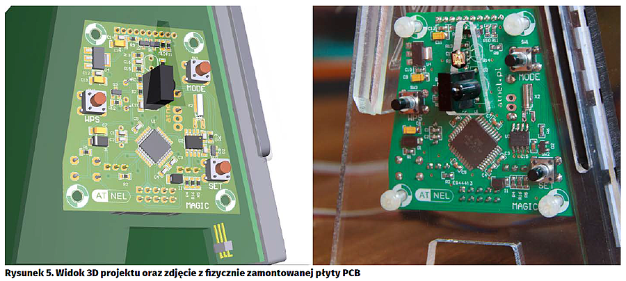 Do modułu jest dołączona niebieska dioda LED (D5), która świeci, jeśli moduł poprawnie przyłączy się do sieci Wi-Fi. Z uwagi na fakt, że moduł Wi-Fi zasilany jest napięciem +3,3 V, a mikrokontroler jest zasilany napięciem +5 V, należy bezwzględnie zadbać o dopasowanie poziomów napięcia na liniach komunikacji UART (RS232). Służy do tego niezawodny układ oparty zaledwie o dwa popularne tranzystory małej mocy MOSFET-N o symbolu BSS138. Oznaczono je na schemacie Q1 i Q2. Wraz z nimi w konwersji napięć biorą udział jeszcze dwa rezystory R8 i R9, oba o rezystancji 10 kV.