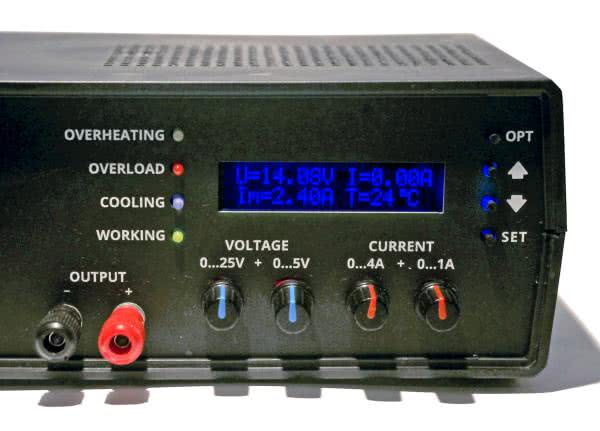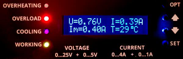 Po załączeniu zasilania i przejściu do normalnego trybu pracy można przystąpić do ustawienia napięcia wyjściowego Uo i limitu prądu Im. Następnie można przyłączyć obciążenie. Prawidłowość wykonania montażu i wszelkich regulacji można sprawdzić z zastosowaniem obciążenia stałoprądowego i impulsowego. Fotografia 20 zawiera oscylogram z testów impulsowych, w których ustawiono Uo=10 V, natomiast obciążeniem były dwa połączone szeregowo oporniki o mocy 10 W i rezystancji 10 V. Jeden z tych rezystorów był zwierany z częstotliwością 100 Hz. Na dole oscylogramu widać przebieg kluczujący, natomiast przebieg górny to składowa zmienna napięcia wyjściowego Uo. Jak widać, pulsacje spowodowane zmiennym obciążeniem nie przekroczyły poziomu 20 mVp-p. Na fotografii 21 pokazano fragment przedniego panelu zasilacza w trakcie pracy z ograniczeniem prądowym z parametrem opóźnienia Ovldwait=5000 ms. Stan ograniczenia prądowego sygnalizuje zaświecony LED OVERLOAD, natomiast rzeczywista wartość prądu Io wynosi 390 mA i (z założenia) jest nieco mniejsza od ustawionego limitu prądowego Im=400 mA.