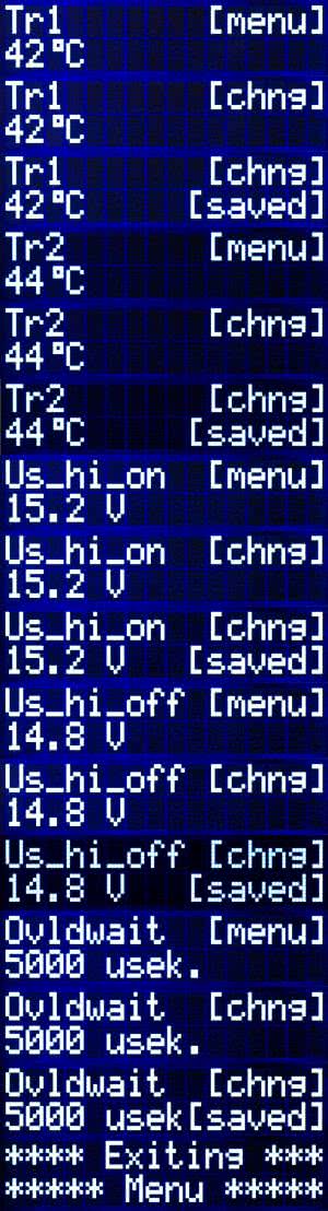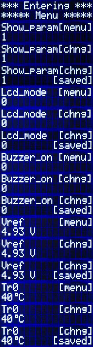 Na fotografiach 18 i 19 zaprezentowano kompletny cykl konfiguracji wszystkich dziesięciu parametrów, który będzie dostępny po wejściu do menu urządzenia poprzez naciśnięcie przycisku OPT. W trybie przeglądu parametrów w menu w prawym górnym rogu ekranu LCD jest wyświetlany komunikat „[menu]”, który po naciśnięciu przycisku SET zmienia się na komunikat „[chng]” informujący o tym, że możliwa jest modyfikacja danego parametru. Zmiany pozycji menu, podobnie, jak zmiany wartości poszczególnych parametrów, wykonujemy przyciskami „up/+” (oznaczony strzałką w górę) oraz „down/–” (oznaczony strzałką w dół). Zatwierdzenie i zapisanie w pamięci EEPROM wartości danego parametru następuje po naciśnięciu przycisku SET i jest sygnalizowane poprzez uaktywnienie czasowe (na około 1 s) w prawym donym rogu ekranu LCD napisu „[saved]”. Z kolei za pomocą przycisku OPT możemy opuścić zarówno podmenu modyfikacji danego parametru, jak i (ostatecznie) całego menu konfiguracyjnego. Parametr Show_params można ustawić na wartość 0 po skrystalizowaniu się ostatecznej konfiguracji zasilacza (unikniemy dzięki temu opóźnienia w jego uruchamianiu, spowodowanego wyświetlaniem ustawień konfiguracyjnych).