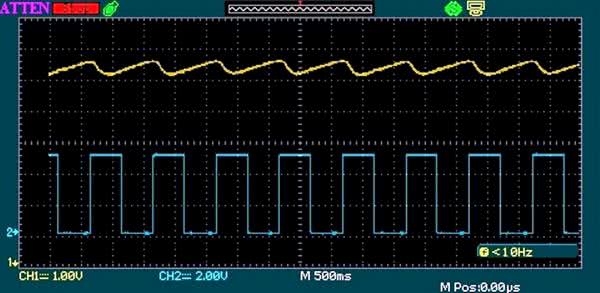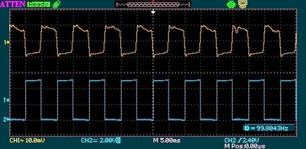 Na fotografii 22 pokazano oscylogram napięcia wyjściowego Uo (przebieg górny) przy przełączanym tranzystorem N-MOSFET obciążeniu 10/20 Ω przebiegiem pokazanym na dole oscylogramu. W tym wypadku częstotliwość przełączania wynosiła tylko 1 Hz, a poziom ograniczenia prądowego Im był ustawiony na połowę prądu występującego przy obciążeniu 10 Ω lub 20 Ω. Ograniczenie prądowe skonfigurowanego do powolnej pracy wolno podwyższało napięcie wyjściowe Uo po rozwarciu bocznika jednego z rezystorów 10 Ω i gwałtownie obniżało je, gdy rezystancja obciążenia spadała z 20 Ω do 10 Ω (nieustalony stan pracy tego mechanizmu).