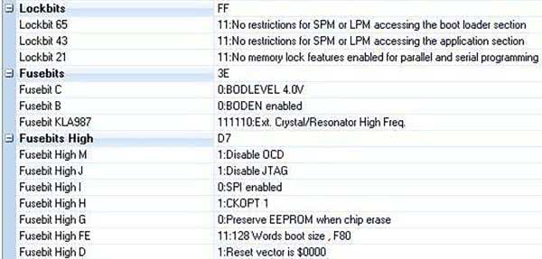 Przed zaprogramowaniem mikrokontrolera U6 należy ustawić w nim właściwą konfigurację fusebitów, których zalecane wartości przedstawiono na rysunku 16.