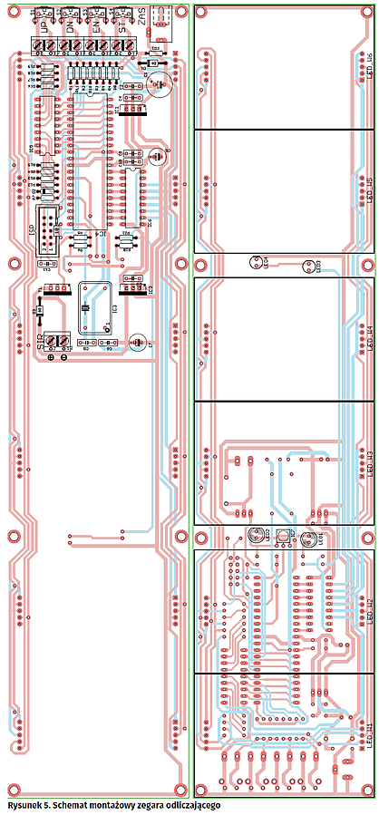 Urządzenie zmontowano na płytce dwustronnej o wymiarach 307 mm×71 mm, pokazanej na rysunku 5. Montaż należy przeprowadzić w dwóch etapach. Najpierw powinny zostać zamontowane wszystkie elementy poza wyświetlaczami. Diody LED stanowiące dwukropki pomiędzy sekcjami wyświetlacza oraz odbiornik podczerwieni należy zamontować po stronie lutowania (strona wyświetlaczy). Następnie, płytkę należy umyć i skontrolować poprawność montażu. Warto też dołączyć zasilanie i skontrolować wartości napięcia w różnych, kluczowych punktach jeszcze przed umieszczeniem układów scalonych w podstawkach. Po zamontowaniu wyświetlaczy jedna strona płytki, strona lutowania, zostanie niemal całkowicie zasłonięta i odszukanie błędów montażowych będzie bardzo utrudnione. Należy też zadbać o to, aby po stronie lutowania wystające wyprowadzenia elementów były ucięte możliwie nisko, w przeciwnym wypadku może być problem z równym ułożeniem wyświetlaczy. Dopiero teraz można zamontować wyświetlacze na płytce, po stronie lutowania.
