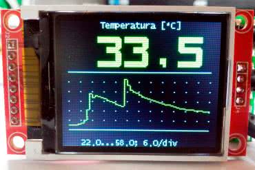 Jako wyświetlacz zastosowany został gotowy moduł – ekran przytwierdzony do niewielkiej płytki drukowanej, która zawiera kilka elementów niezbędnych do jego prawidłowej pracy oraz wyprowadzenia w postaci szpilek goldpin. Wyświetlacz posiada matrycę RGB o rozdzielczości 160×128 pikseli. Barwa każdego piksela określana jest 16 bitową wartością, która odpowiada kolorom RGB według schematu 5-6-5. Łatwo zauważyć, że przesłanie treści całego wyświetlacza wymaga przesłania ponad 40 kB danych. Dlatego wyświetlacz został wyposażony w kontroler typu ST7735S z szybkim interfejsem SPI. Podświetlanie wyświetlacza doprowadzone jest poprzez tranzystor T1 sterowany sygnałem PWM z mikrokontrolera, wartość wypełnienia jest stała, wynosi ok. 80%.