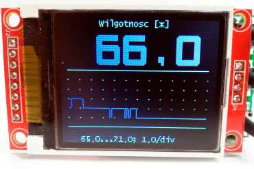 Pomiar wilgotności wykonywany jest za pomocą popularnego czujnika DHT11. Ten element nie sprawiłby problemów z montażem, ale zastosowanie oddzielnego modułu, umieszczonego w pewnym oddaleniu od płyty głównej ma tę zaletę, że czujnik jest w mniejszym stopniu narażony na czynniki zakłócające pomiar – czyli głownie na ciepło wydzielane przez elementy płyty głównej. Komunikacja z czujnikiem odbywa się poprzez jednoprzewodowy interfejs Single wire, który nie jest kompatybilny z interfejsem 1Wire. Sposób komunikacji jest prosty, najpierw urządzenie nadrzędne ustawia stan niski o czasie trwania co najmniej 18 ms a następnie czujnik przesyła 16 bitów wartości wilgotności, 16 bitów wartości temperatury i na koniec 8 bitów kontrolnych, pozwalających zweryfikować poprawność danych.