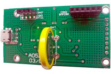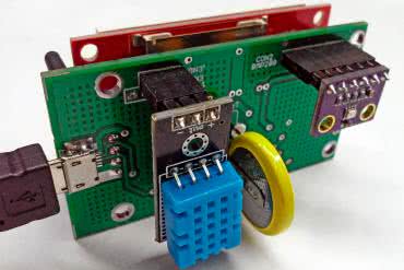 Na schemacie nie widać czujników odpowiedzialnych za pomiar parametrów powietrza, dlatego, że zastosowano gotowe moduły. Takie rozwiązanie pozwoliło ominąć problem montażu skomplikowanych, miniaturowych podzespołów. Co ciekawe – kosztują mniej niż same czujniki. Moduły dołączane do odpowiednich złącz w tylnej części zegara (fotografia 6).